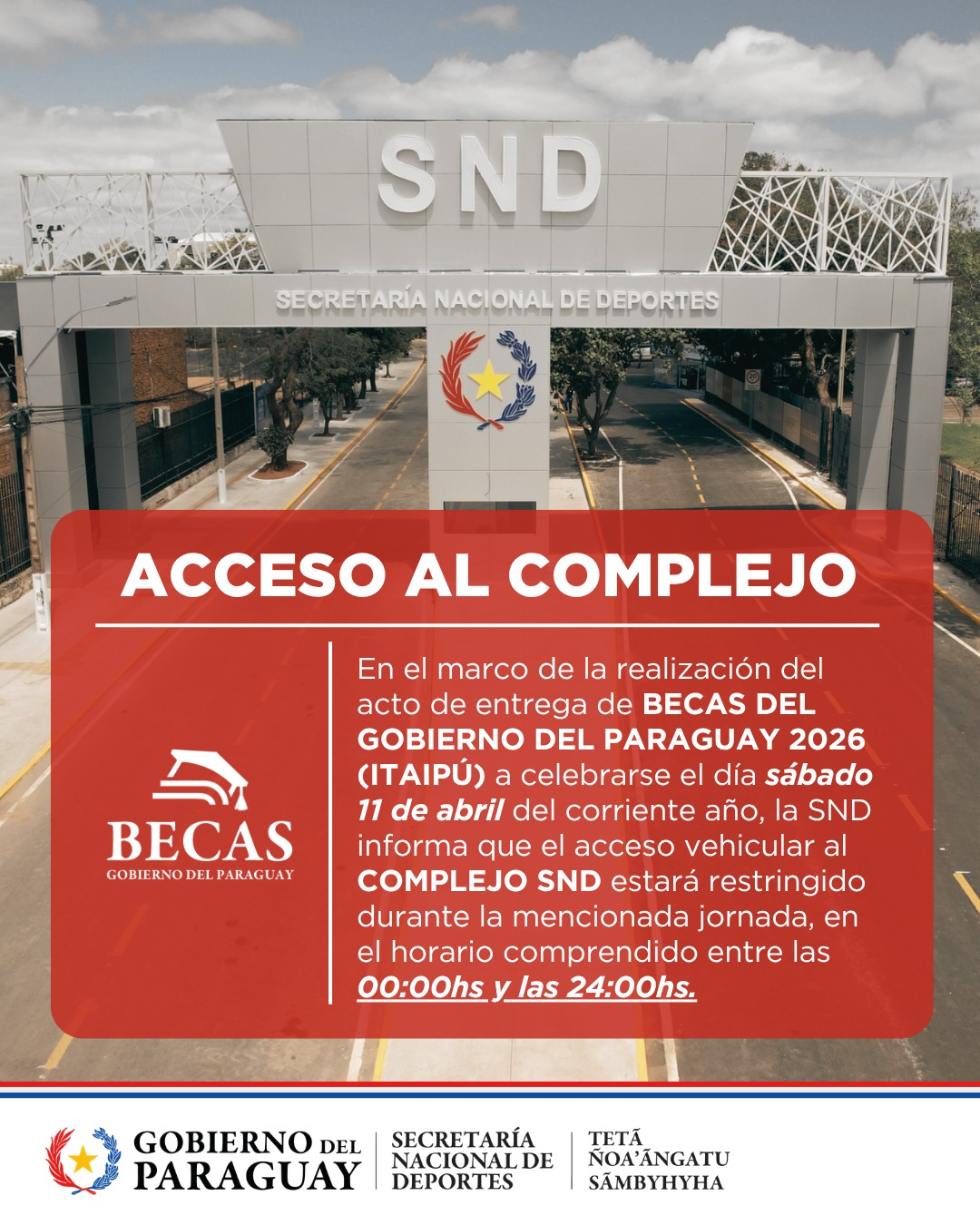 En el marco de la realización de la Entrega de Becas del Gobierno del Paraguay a celebrarse este sábado 11 de abril, en la Ueno SND Arena, la SND informa que el acceso vehicular al Complejo SND estará restringido durante la mencionada jornada, en el horario comprendido entre las 00:00hs y las 24:00hs.